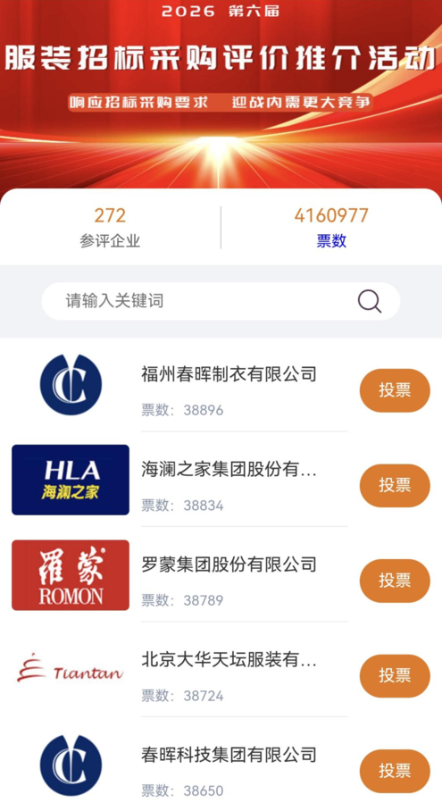 为助力优秀诚信的服装供应商进一步提高品牌价值和强化品牌上风,在招标采购商场中赢得更多的份额,中国采购与招标网、中国名企名次网聚集专揽了以“反馈招标采购要求、迎战更大内需竞争”为主题的“2026(第6届)服装招标采购评价推介举止”。举止现已进入尖锐化的网上展示和投票阶段。专揽单元现发布举止第三期情况通报。